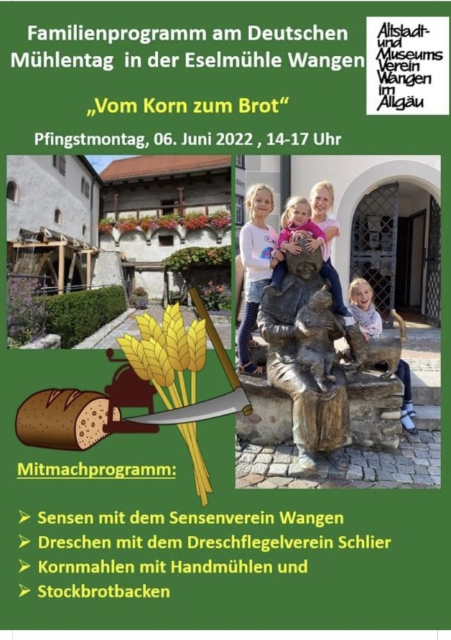 "Vom Korn zum Brot" ist das Motto des diesjährigen Mühlentags. Ein buntes Mitmachprogramm für Groß und Klein erwartet Sie rund um die Eselmühle in Wangen.